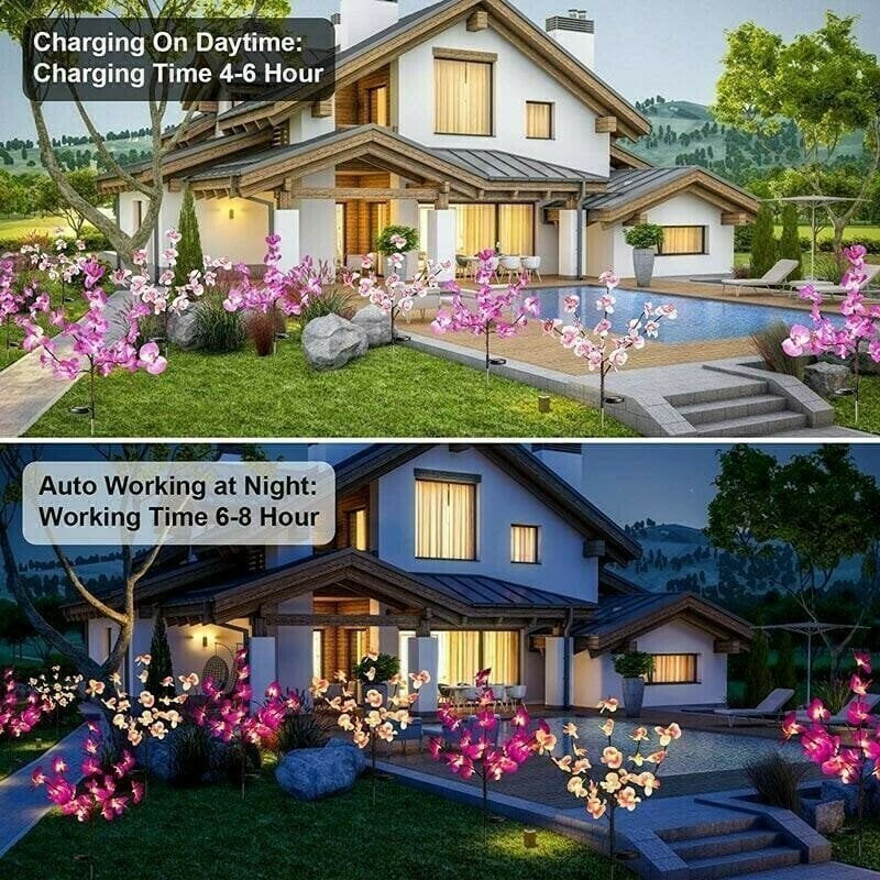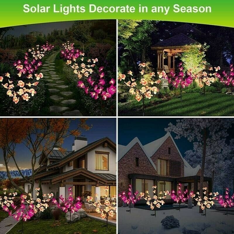 • UPGRADED SOLAR LIGHT: Our Solar ORCHID FLOWER Lights add flower number to 20 Flower and upgraded a wider solar panel 135-degree folding, which converts sunlight into power faster and more efficiently. Automatically lights up in the dark No wire external electricity is required to illuminate your Patio Yard.
